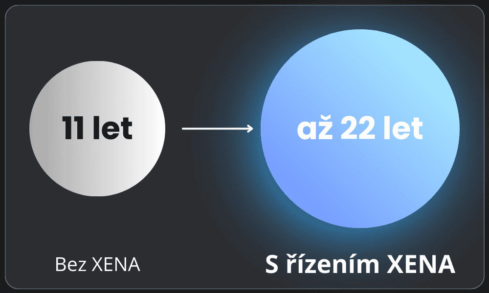 Šetrné řízení cyklů (limity SOC, teploty, balancování) zpomalují degradaci. Bez XENA ~11 let → se XENA až ~22 let. Delší životnost, stabilní výkon.